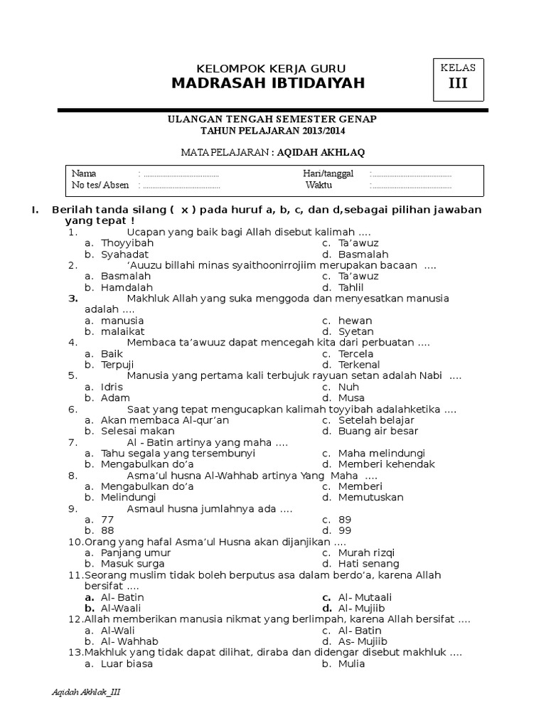Tergantung kalender pendidikan yang direncanakan di semester awal tahun pelajaran 2021. Soal PAT Akidah Akhlak Kelas 1 MI dan Kunci Jawaban. Berilah tanda silang x didepan huruf ab atau c didepan jawaban yang benar.