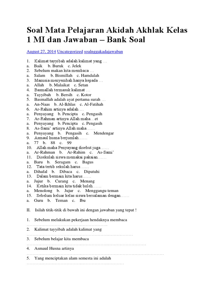 Soal Mata Pelajaran Akidah Akhlak Kelas 1 Mi Dan Jawaban